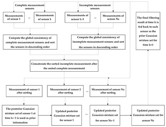 Multi-sensor centralized fusion primarily relies on three filtering methods: parallel filtering, data compression filtering, and sequential filtering [41]. Among them, parallel filtering merges all the measurements reported by sensors at time into a global measurement by expanding the dimensions, and then it performs a one-time update on the target state. However, due to the data expansion, high-dimensional matrix multiplication and inversion operations are introduced, leading to increased computational complexity. Consequently, this approach is rarely used in multi-sensor multi-target fusion. Data compression filtering is mainly suitable for data fusion among homogeneous sensors. For data fusion between heterogeneous sensors, the mismatch in measurement noise covariances can significantly affect the fusion results. Sequential filtering treats the measurements provided by each sensor at time as independent new measurements and processes them sequentially. This approach does not require extending all measurements, thus avoiding a significant increase in computational complexity. Furthermore, it independently updates the target state based on the measurements from each sensor, mitigating the need to match measurement noise covariances between sensors. Therefore, sequential filtering becomes the primary approach for handling data fusion in scenarios involving heterogeneous sensors.