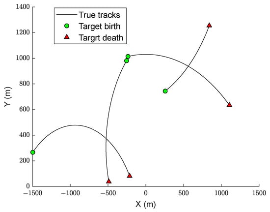 where represents the RFS of clutter, and is the RFS of target measurements obtained from the detection of target . The target is detected with a probability , generating measurement , and may be missed with a probability of , with its measurement represented as . In a linear Gaussian multi-target tracking system, the probability density of the measurement likelihood function can be modeled as