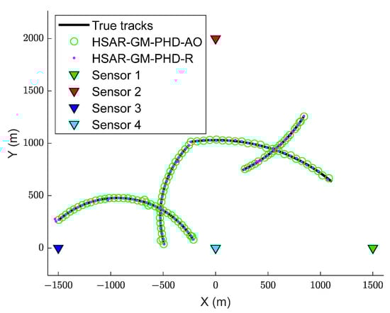 As shown in Figure 16 and Figure 17, and Table 8, when detection probability and clutter intensity are different, the two algorithms exhibit significant differences in target number estimation and OSPA distance estimation. In comparison to the HSAR-GM-PHD-AO algorithm, the HSAR-GM-PHD-R algorithm’s target number estimation fluctuates dramatically around the true value. Specifically, the HSAR-GM-PHD-AO algorithm has an average target number estimation of 4.05 during the 40 s–80 s time interval, with a deviation of 0.05 from the true target number. At the same time, the average OSPA distance is 12.58. In contrast, the HSAR-GM-PHD-R algorithm has an average target number estimation of 3.81 during the 40 s–80 s time interval, with a deviation of 0.19 from the true target number. The average OSPA distance is 17.72. Because different sensors have varying detection probability and clutter intensity, their performance differs significantly. Consequently, the sequential fusion order of sensors has a considerable influence on the final fusion results, surpassing the impact of individual detection probability or clutter intensity. The simulation results demonstrate that the proposed HSAR-GM-PHD-AO algorithm can efficiently determine the optimal fusion order for sensors in real time, achieving optimal sequential fusion. In this regard, the HSAR-GM-PHD-AO algorithm reduces the OSPA distance relative to the HSAR-GM-PHD-R algorithm by 34.65%.