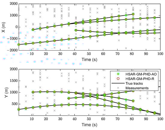 Figure 14 and Figure 15 illustrate the performance comparison between the HSAR-GM-PHD-R algorithm and the HSAR-GM-PHD-AO algorithm when the detection probability is the same but the clutter intensity varies.