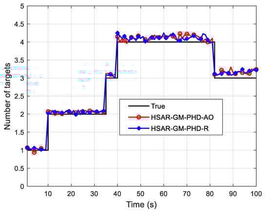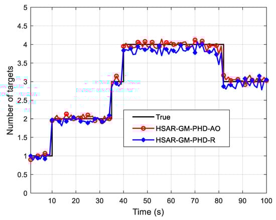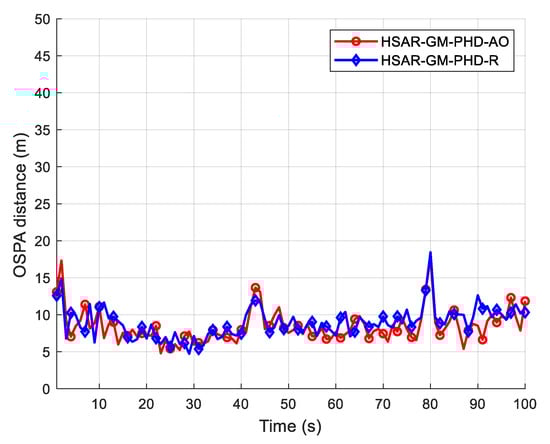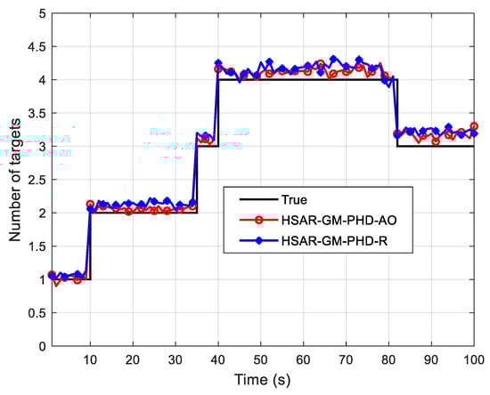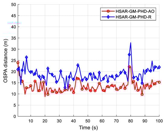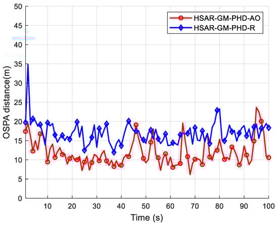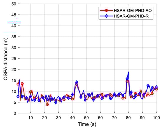 Figure 12 and Figure 13, along with Table 6, demonstrate notable differences in target number estimation and OSPA distance estimation between the HSAR-GM-PHD-R algorithm and the HSAR-GM-PHD-AO algorithm when considering different detection probabilities but the same clutter intensity. The HSAR-GM-PHD-AO algorithm exhibits target number estimates that closely align with the true values, with minimal fluctuations, and maintains relatively low OSPA distances. Conversely, the HSAR-GM-PHD-R algorithm tends to overestimate the number of targets, resulting in more pronounced fluctuations around the true values and higher OSPA values. Specifically, in the 40 s–80 s time period, the HSAR-GM-PHD-AO algorithm achieves an average target number estimate of 4.12, deviating by 0.12 from the true target number. The average OSPA distance during this period is 11.23. In contrast, the HSAR-GM-PHD-R algorithm yields an average target number estimate of 4.21, deviating by 0.21 from the true target number, with a notably higher average OSPA distance of 16.57. The differences in performance arise from the fact that, when varying detection probabilities across different sensors, the sequential fusion order of different sensors can have a significant impact on the final fusion result. The HSAR-GM-PHD-AO algorithm proposed in this study efficiently plans the optimal fusion order for sensors in real time, achieving superior fusion results. Specifically, the HSAR-GM-PHD-AO algorithm achieves a 32.2% reduction in OSPA distance compared to the HSAR-GM-PHD-R algorithm. Therefore, the proposed HSAR-GM-PHD-AO algorithm outperforms the HSAR-GM-PHD-R algorithm in overall performance.