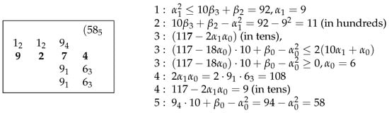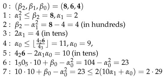 With the notation used in this paper, the corresponding computation is given in Figure 2 where the numbered lines correspond to the seven steps and to the tables in Figure 1. The subscripts where the digit is inserted in Figure 3 correspond to table in Figure 1 and line number in Figure 2. Note that is the number 46 (in tens) where 4 (in hundreds) is computed in line 2 and is the second digit in 864.