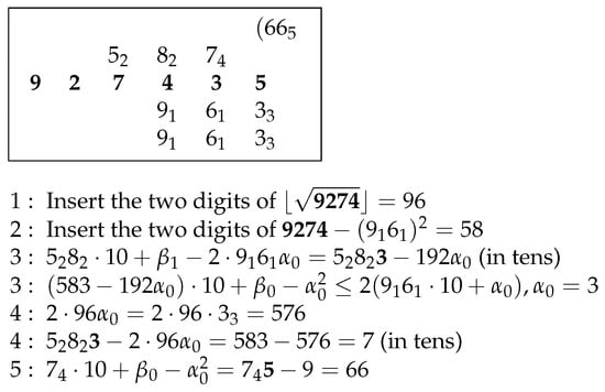Table 1 summarizes the finding in [19] and gives an overview of the different examples and the inequalities used to determine the last digit . The first column contains the number to be taken square root of, N, the second column contains a reduced number consisting of the digits of N except the two last digits, n, the third and fourth columns contain the integer part of the square root of the reduced number, a, and its remainder . The first five examples are from Liber Abaci, while the remaining eleven examples are from De Practica Geometrie.