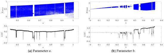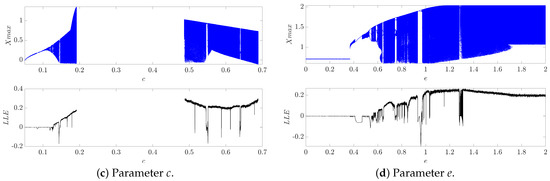 Let us plot the bifurcation diagrams to investigate the dynamics of systems (1) and (4). The bifurcation diagram depicts the local maxima of the system for a certain range of parameter values and can provide a rough estimate of whether the system converges to a single point, is periodic, or possesses chaotic behavior. To further examine the dynamics of a discrete map, its bifurcation diagrams and corresponding largest Lyapunov exponents (LLE) for parameters a, b, c, and e were calculated, as shown in Figure 1.
