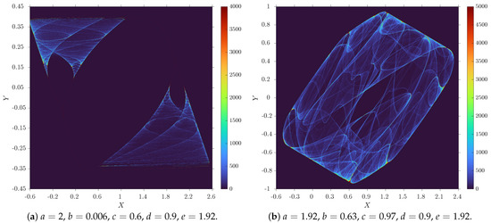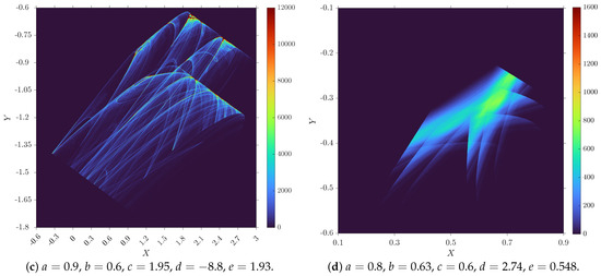 Figure 2 shows a modified version of the canonical phase portrait that resembles a bifurcation diagram at first sight. However, the color in this diagram represents the number of returns of the trajectory to the vicinity of a certain point. The points that the trajectory visits too often and the corresponding values of the map parameters are not well suited for pseudorandom bit generation because the resulting bit sequence will not satisfy the conditions of statistical tests for randomness and, therefore, will not be pseudorandom. The set of parameters presented in Figure 2c also does not fit this purpose. Therefore, the parameters where the bit sequence can be random enough are chosen as shown in Figure 2b,d. From the last two suitable parameter sets, the set shown in Figure 2b was finally chosen as the main solution because it has a larger p-value than the parameter set given in Figure 2d.