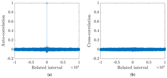 (a) Autocorrelation and (b) cross-correlation for and , with , , , , . The analysis confirms the unpredictability of the bitstream.