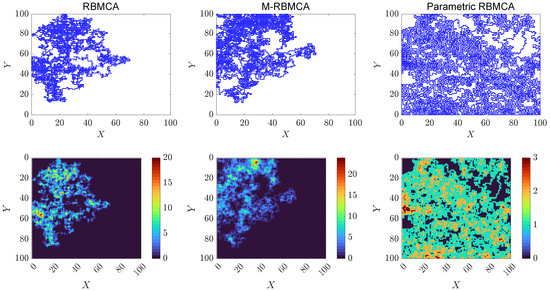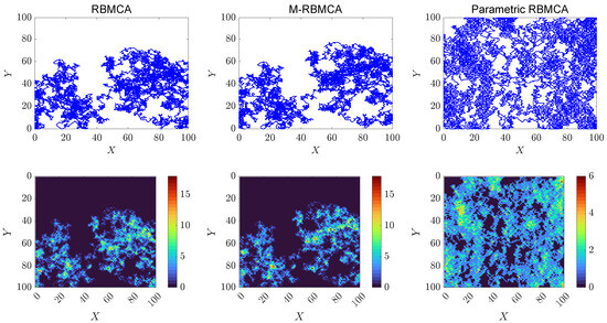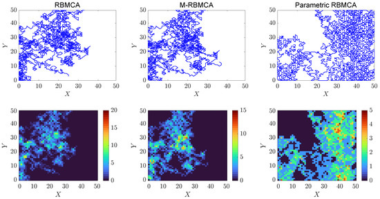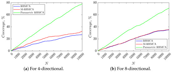 One can see from the plots shown in Figure 9 that the proposed algorithm P-RBMCA covers the 50 × 50 test study area much faster than the competing algorithms RBMCA and M-RBMCA. For a more detailed quantitative comparison, the reader can refer to Table 3 and Table 4, which illustrate the dependence between the percentage of coverage and the number of iterations. One can see that when the number of possible directions equals 4, it takes only 5050 iterations for P-RBMCA to completely cover the study area, while RBMCA and M-RBMCA do not cover the study area even after 10,000 steps. The same picture can be observed in the case of eight-directional movement. This version of the algorithm covers the study area in 6330 steps.