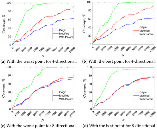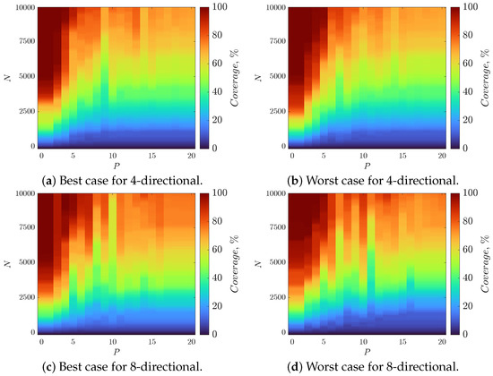 Considering the proposed P-RBMCA path-planning method, one can see that the robot avoids multiple visits to previous points, which helps to increase the coverage. The results of the algorithm execution are shown in Figure 4 and Figure 5. The introduced parameter P allows one to finely adjust the density of filling points and the percentage of coverage of the area. One can conclude that the overall performance of the proposed P-RBMCA algorithm is superior than that of the competing RBMCA and M-RBMCA methods. It should be noted that when the p value is changed, it leads to corresponding changes in both the uniformity of filling points and the percentage of coverage. The percentage of coverage also slightly depends on the initial position of the robot. Plots given in Figure 8 show the dependence of the percentage of coverage on the value P and the number of iterations of the algorithm for four- and eight-directional movement cases.