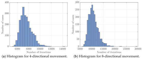 Let us plot the histograms depicting the number of cases when covering the study area, which took a certain number of iterations (Figure 11). To construct such a histogram, let us set a test area size equal to 50 × 50 and execute the investigated algorithm, changing the starting point of the robot from [0; 0] to [50; 50]. As a result, 2500 paths filling the study area are obtained. Based on these data, one can conclude that the starting point affects the coverage rate. This can be seen very well if we consider the eight-directional case, where the maximum number of iterations is more than 20,000 steps.