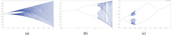 To determine the parameters where each map will demonstrate chaotic behavior, the bifurcation diagrams were plotted (Figure 12). For every map, we selected values that satisfy two conditions: the map should possess chaotic behavior and should pass all NIST tests. Parameter values for each investigated map are as follows: Tent: , ; Log: , ; Gauss iterated map: , , ; Moysis et al. map: , , ; Sine map: , .