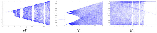 Bifurcation diagrams for all considered chaotic maps. (a) Tent map. (b) Logistic map. (c) Gauss iterated map with . (d) Sine map. (e) Parameter b for Moysis et al. [43] map. (f) Parameter r for Moysis et al. [43] map.