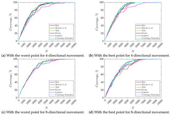 Dependence of the coverage percentage to the selection of chaotic map and the number of iterations for the best and worst starting points, 4- and 8-directional cases, for a 50 × 50 test area.