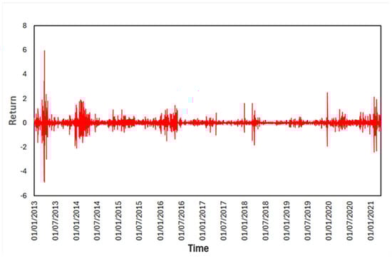 Once we determined that the series under examination was not stationary, the log-returns series (from now on referred to as returns series) was obtained as described: such that represents the time series data at time t. The return series possesses crucial properties such as stationarity, an essential property since it is a prerequisite for most of procedures used further on.