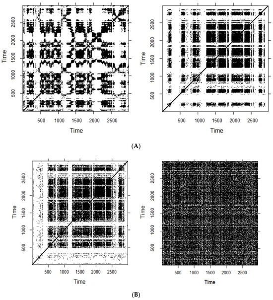 - The recurrence plot, a visual tool that permits an analysis of the existence of periodic patterns, among other aspects of time series [34]. In addition, Recurrence Quantification Analysis is utilized to provide clarity on the information presented by the recurrence plots.
