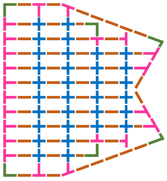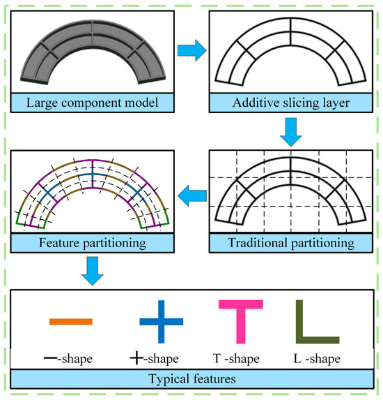 With the development of additive manufacturing technology, metal additive manufacturing components entail challenges as large-scale, complex structures regarding configuration topology, structure–function integration, and gradient composite [24]. Traditional partitioning methods face some challenges such as lengthy preparation times for forming process documentation, limited portability across different components, and inadequate quality stability. In order to effectively deposit and manufacture large-scale metal components, a partitioning method based on typical geometric features is proposed in this paper. The typical geometric features were processed as − shape, + shape, T shape, and L shape. The traditional partitioning method and feature partitioning method are illustrated in Figure 2.