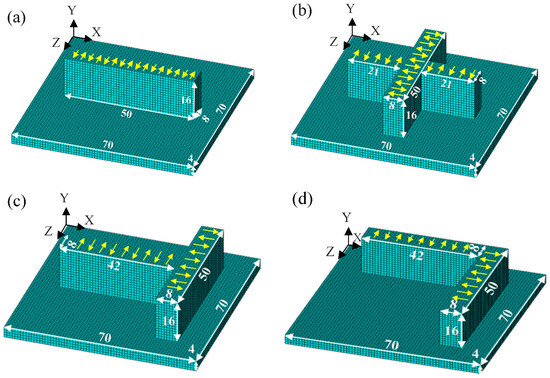 Feature model mesh size and scanning strategy: (a) − shape, (b) + shape, (c) T shape, (d) L shape.