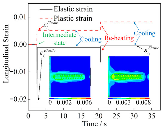 LDM can be considered a multi-track, multi-layer welding process. Therefore, the inherent strain method can be used to predict the deformation of additive components. During the laser deposition, as the heat source moves, the molten pool rapidly cools and solidifies, experiencing significant contraction strains. The elastic strains in each deposited layer are influenced by changing constraint boundaries. Consequently, the original inherent strain theory needs to be modified to enhance the accuracy of deformation prediction for laser-deposited manufactured components. In this study, the intermediate state and steady state were selected to consider the effect of elastic strains that were not fully released during the deposition process due to the evolution of constraint boundaries. The thermoelastic–plastic method was employed to investigate the variation patterns of elastic strains and plastic strains at different moments in the single-pass, double-layer deposition model, as shown in Figure 5. The intermediate state occurred just after the heat source had passed and the compressive strain had reached its maximum value. The steady state was defined as the state when the deposited component was cooled to room temperature. The expression for the corrected inherent strain is given by the following equation: