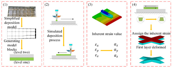 The inherent strain method [16] is commonly used to predict residual stresses and deformations in metal welding. This method was first proposed by Ueda et al. in 1975 [17,18]. It replaces the entire complex welding process with representative values of inherent strain and calculates stress and deformation using elastic calculations. However, due to the differences between additive manufacturing and welding processes, modifications are needed to predict the deformation of additive components accurately. Liang et al. [19,20,21] modified the inherent strain method by studying the forming characteristics of additive manufacturing. They developed a method to extract and incorporate inherent strains into large-size structures, resulting in accurate deformation predictions with high computational efficiency. Chen et al. [22] further improved the method by extracting inherent strain from a thermoelastic–plastic model and using it to simulate large-size structures through finite element analysis. Tran et al. [23] explored the relationship between inherent strain values in small-scale and large-scale models, using the local-to-whole analysis method to predict the deformation of large and complex components.