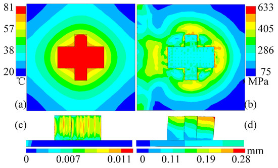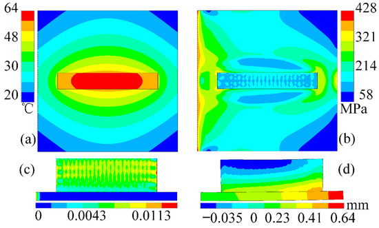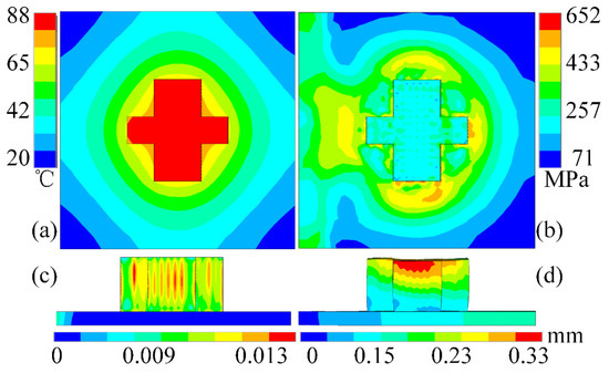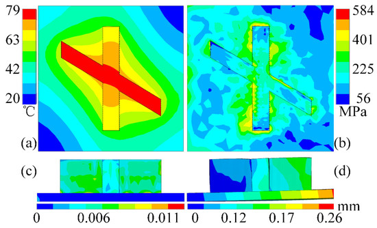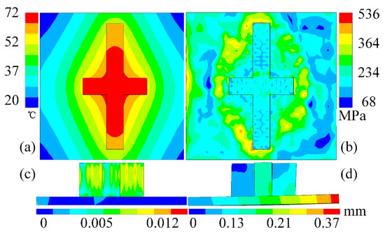 Resulting contour for W2 length of 14 mm: (a) temperature field, (b) stress field, (c) strain field, (d) deformation field.