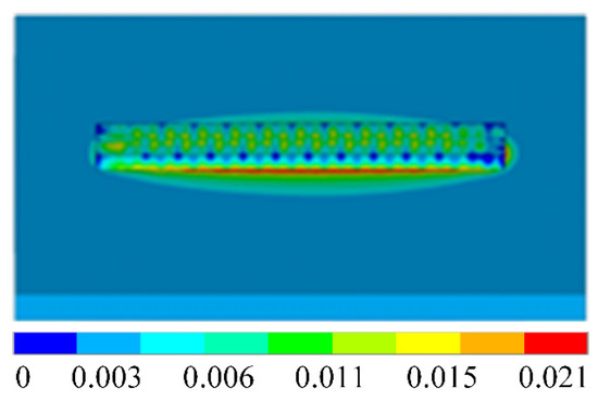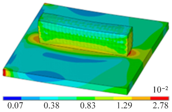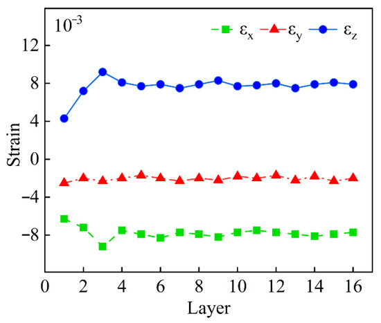 The thermoelastic–plastic calculation provided the temperature distribution, stress distribution, strain distribution, and deformation distribution of the thin-walled feature partition components. Contour diagrams depicting the strain distribution of the thin-walled feature partition components after cooling for 500 s at the end of deposition are displayed in Figure 7. From the strain contour diagram, it can be observed that the strain values were uniformly distributed in the deposition direction after cooling, but they varied across the cross-section. Therefore, it was necessary to investigate the change in strain values on the cross-section of a single layer.