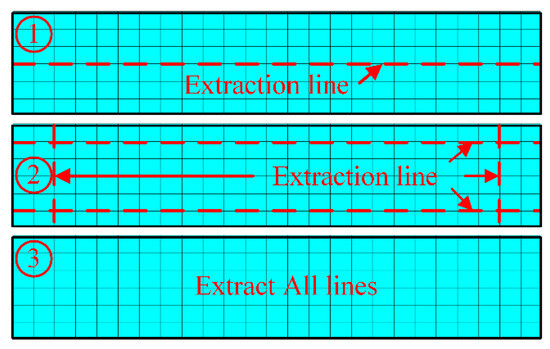 The second layer at the end of the deposition was selected to explore the change in strain values on the cross-section of a single layer. The strain distribution contour diagram of the thin-walled feature partition components in the second layer of the LDM process is presented in Figure 8. The contour diagram highlights the directional nature of the strain value distribution. The strain values at the edge of the deposited layer were small. To examine the effect of different extraction paths on the average inherent strain of the deposited layer, three extraction methods (as shown in Figure 9) were employed. The first method involved extracting all nodes along the middle line of the deposition direction and averaging the extracted values as the inherent strain value. The second method extracted the node strains from two horizontally and vertically aligned lines and took the average value as the extracted inherent strain value. The third method involved extracting all the node strains from a single layer and taking the average value as the final strain value. The strain values obtained from the three methods were then added to the model to obtain the final simulation results.