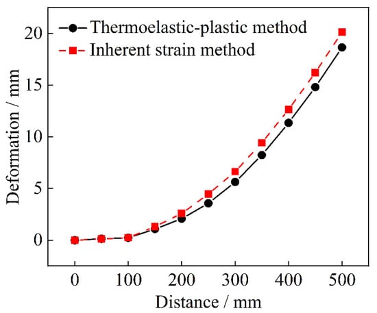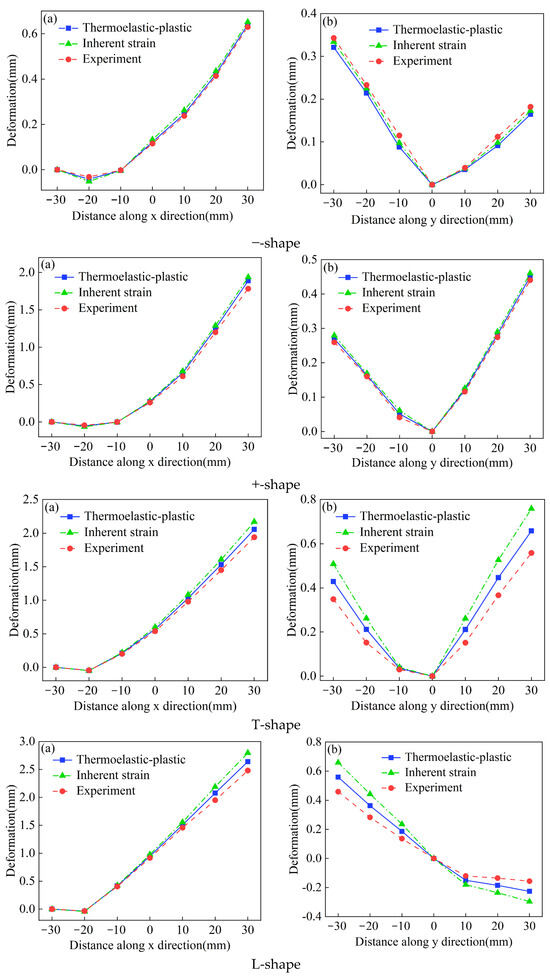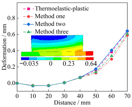 According to the three strain extraction methods, the average inherent strain of the sedimentary layer was determined. To assess the impact of different inherent strain values obtained from the extraction paths on the accuracy of deformation prediction, the thermoelastic–plastic method and the inherent strain method were separately employed to predict the deformation of the components in the same model. The predicted results were then compared, and the corresponding comparison curves are presented in Figure 10.