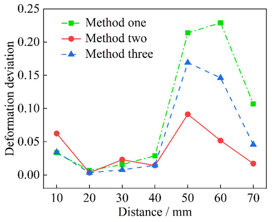 The results indicate that, at the constrained end, the deformation predicted by the three extraction methods aligned with the deformation obtained using the traditional method. Conversely, at the free end, the deformation predicted by the second extraction method exhibited a higher level of consistency with the results using the traditional method. The compared results showed a slight deviation. Analyzing the comparison curves of the deformation deviation for different extraction schemes in Figure 11 reveals that the distribution of the strain was directional. The first extraction method overlooked the impact of directionality on the value of the single-layer strain, resulting in significant differences in the deformation prediction results. On the other hand, the third extraction method captured all nodes through the previous cross-sectional strain contour. The effective strain value region was concentrated in the central area, with less coverage in the edge region of thermal accumulation, leading to fewer deformation results. Consequently, the second method (two transverse and two longitudinal paths) proved to be optimum for extracting the inherent strains.