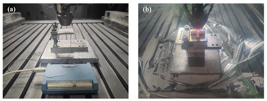 To verify the accuracy of deformation prediction for the additive components based on the inherent strain method, the deformation of different typical feature partitions was simulated using the thermoelastic–plastic method, the experimental method, and the inherent strain method. LDM of each typical feature partition was conducted using LDM-800 additive equipment. Argon was used as a protective gas during the deposition process. Figure 12 displays the experimental equipment and operational status. Ti65 spherical powder with an average particle size of 150 µm was used. During the deposition process, an internal temperature measurement of the substrate was taken using a K-type thermocouple with a diameter of 0.5 mm (indicated as red marked points in Figure 13). After the deposition was completed, a Hexagon coordinate measuring machine, model SF 4.5.4 with an accuracy of 10 µm, measured the deformation at the transverse and longitudinal centerline of the bottom surface of the substrate (indicated as black marked points in Figure 13). The same process parameters described in Section 2.2 were employed in both the experiments and the numerical simulations. During the experiments, the substrate was subject to one-sided clamping constraints.