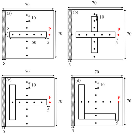 Temperature and displacement measurement points: (a) − shape, (b) + shape, (c) T shape, (d) L shape.