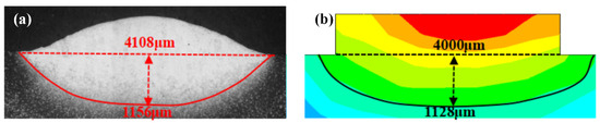 This study developed a single-layer deposition model to investigate the morphology of the molten pool during the LDM process through numerical simulation and experimental methods. The melt width and depth of the melt pool obtained using both methods are illustrated in Figure 14. The dimensions of the melt pool morphology obtained from the experiment and simulation matched, indicating the accuracy of the heat source model proposed in this study.