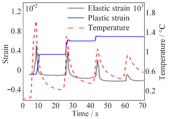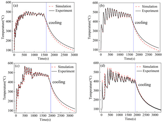 To verify the accuracy of the finite element analysis method, this study adopted both the thermoelastic–plastic method and the experimental method to obtain the temperature change curve for each typical feature partition. As depicted in the temperature change curves in Figure 15, the temperature change patterns for different feature divisions aligned well with the experimental results. However, during cooling, the simulation temperature dropped faster than the observed temperature due to the use of a room temperature of 20 °C in the simulation process. This temperature difference created a higher temperature gradient, resulting in faster heat dissipation compared to the experimental environment.