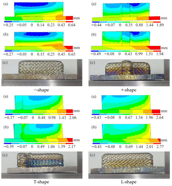 Comparison of four feature deformation contours: (a) thermoelastic–plastic method, (b) inherent strain method, (c) experimental measurement.