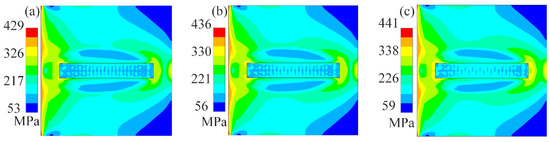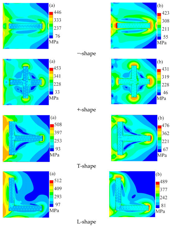 Comparison of four feature stress contours: (a) thermoelastic–plastic method and (b) inherent strain method.