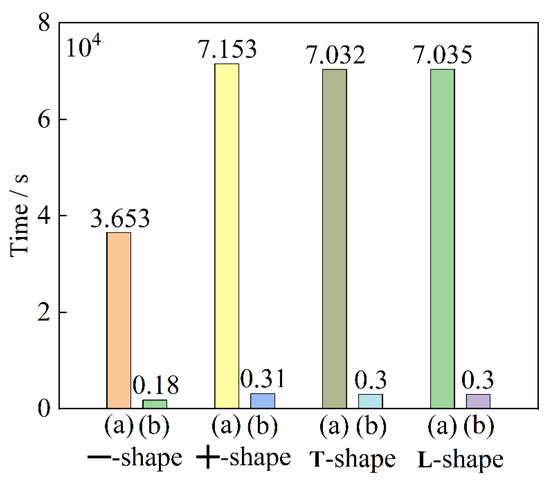 To compare the computational efficiency of the thermoelastic–plasticity method with that of the inherent strain method, the simulation time for the four feature shapes is plotted in Figure 19. The inherent strain method could improve the computational efficiency of predicting the deformation of additive components by up to 20 times compared to the traditional thermoelastic–plasticity method, meeting the demand for the rapid prediction of the deformation of large additive components.