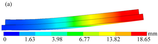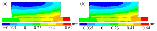 Comparison of titanium alloy frame beam deformation contour: (a) thermoelastic–plastic method and (b) inherent strain method.
