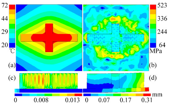 Following the temperature field distribution obtained from the heat conduction simulation, the calculated results were inputted into the mechanical model for stress field analysis. The thermodynamic coupling calculations considered the temperature-dependent Young’s modulus, yield strength, and Poisson’s ratio. The thermophysical and thermodynamic parameters of Ti65 [28] titanium alloy with respect to temperature are presented in Table 2 and Table 3, respectively.