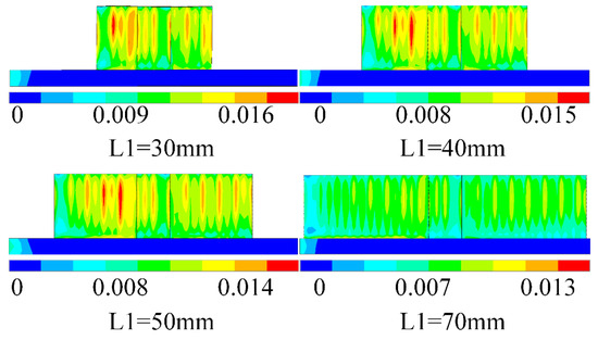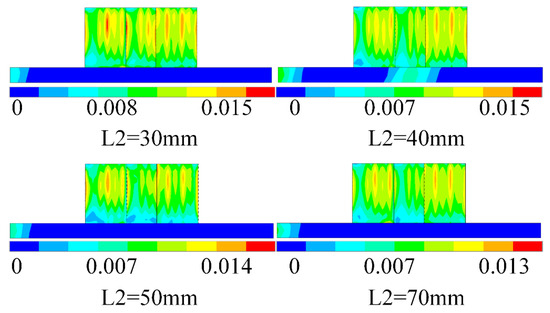 To explore the effect of L2 size on strain value, W1, W2, and L1 remained unchanged while L2 was altered. The wall lengths of L2 of the +-shaped features were set as 30 mm, 40 mm, 50 mm, 60 mm, and 70 mm, respectively. Through thermoelastic–plastic method calculations, the temperature, stress, strain, and deformation fields of the +-shaped, thin-walled feature partitions with different L2 lengths were obtained. Contour diagrams illustrating the resultant distribution of the +-shaped, thin-walled feature partitions with an L2 length of 60 mm after 500 s of cooling at the end of deposition are provided in Figure 31. The strain distribution contour diagrams of the +-shaped, thin-walled feature partitions with other sizes are shown in Figure 32.