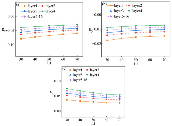 Variation curves of strain values with L1 length for each layer: (a) X direction, (b) Y direction, (c) Z direction.