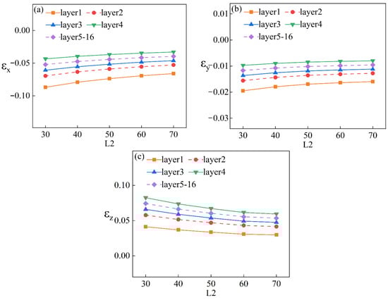 Variation curves of strain values with L2 length for each layer; (a) X direction, (b) Y direction, (c) Z direction.
