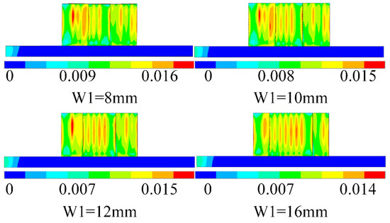 L1, L2, and W2 were kept constant while only W1 was varied to investigate the impact of W1 size on strain values. The width of a wall of the +-shaped feature, W1, was set at 8 mm, 10 mm, 12 mm, 14 mm, and 16 mm, respectively. Using the thermoelastic–plastic method, the temperature, stress, strain, and deformation fields of the +-shaped, thin-walled feature partitions with different W1 widths were calculated. After 500 s of cooling at the end of the deposition, the resulting contour diagrams of the +-shaped, thin-walled feature partitions with a width W1 of 14 mm are displayed in Figure 34. The strain distribution contour diagrams of the +-shaped, thin-walled feature partitions with other sizes are presented in Figure 35.