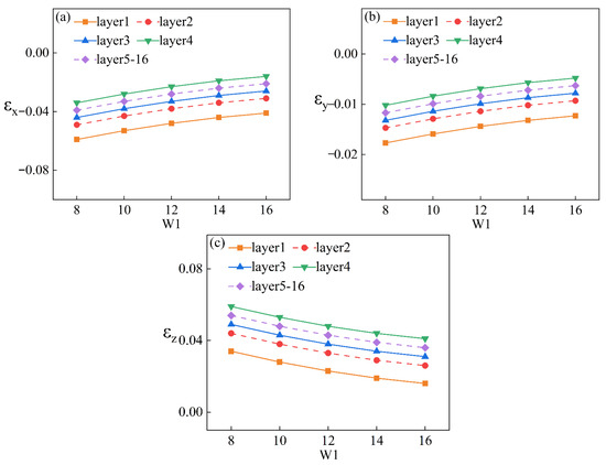 Variation curves of strain values with W1 width for each layer: (a) X direction, (b) Y direction, (c) Z direction.