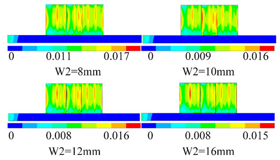 Similarly, L1, L2, and W1 remained constant, while W2 was varied to explore the influence of W2 size on strain values. The width W2 of a wall of the +-shaped feature was set at 8 mm, 10 mm, 12 mm, 14 mm, and 16 mm, respectively. By utilizing the thermoelastic–plastic method, the temperature, stress, strain, and deformation fields of the +-shaped, thin-walled feature partitions with different W2 widths were calculated. The resultant contour diagrams of the +-shaped, thin-walled feature partitions with a width W2 of 14 mm after 500 s of cooling at the end of deposition are illustrated in Figure 37. The strain distribution contour diagrams of the +-shaped, thin-walled feature partitions with other sizes are shown in Figure 38.