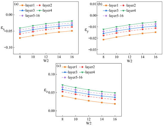 Variation curves of strain values with W2 width for each layer: (a) X direction, (b) Y direction, (c) Z direction.