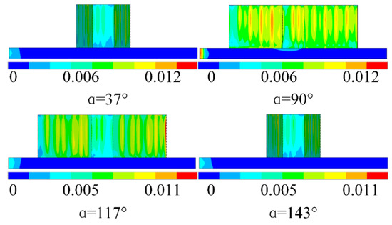 Using the thermoelastic–plastic method, calculations were conducted to obtain the temperature, stress, strain, and deformation of the +-shaped, thin-walled feature partition with different feature angles. After 500 s of cooling at the end of the deposition, the resultant contour diagram of the +-shaped, thin-walled feature partition for a feature angle α of 63° is presented in Figure 41. The strain distribution contour diagrams of the +-shaped, thin-walled feature partitions with other sizes are displayed in Figure 42.