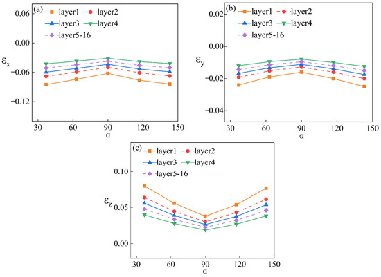 Variation curves of strain values with α angle for each layer: (a) X direction, (b) Y direction, (c) Z direction.