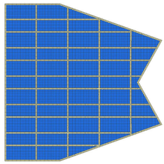 To demonstrate the advantages of feature partitioning and the inherent strain method in predicting deformation for large additive components manufactured through laser deposition, titanium frame beams with dimensions of 500 mm × 500 mm × 12 mm were investigated in this study. The finite element model of the titanium alloy frame beam is shown in Figure 44. The inherent strain method and the traditional thermoelastic–plastic method were employed to simulate the stress and deformation of the component during the LDM process. The feature partitioning of the typical frame beam is shown in Figure 45. The numerical simulation adopted the same method and material parameters as outlined in Section 2.2; the mesh size was set at 2 mm × 2 mm × 1 mm, and a one-sided fixed constraint was imposed during the simulation.