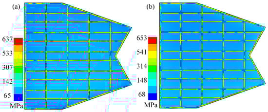 Comparison of stress contour diagrams of titanium frame beams: (a) thermoelastic–plastic method and (b) inherent strain method.