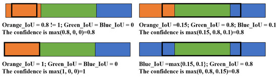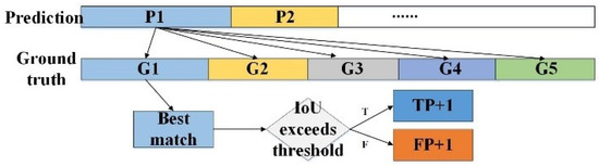 The calculation process of , , and are illustrated in Figure 8. In this approach, the IoU for each ground truth segment and predicted segment was computed to determine whether they are classified as or .