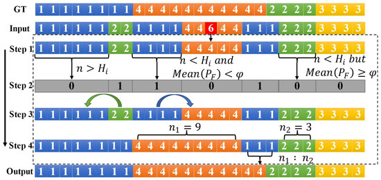 Drawing inspiration from the Enhanced Temporal Segment Networks (ETSN), our study posited that over-segmentation errors predominantly arise from the excessive identification of local segments. By integrating the concept of non-maximum suppression (NMS), we employed unsupervised adaptive internal block suppression to eliminate superfluous short segments within the prediction sequence. This method also allowed for the adaptive determination of hyperparameters based on the input video information. As shown in Figure 6, short segments whose length fell below a predetermined threshold were merged with an adjacent longer segment—for example, combining segments “22” and “6”. Subsequently, brief segments with low confidence were allocated to the nearest segment with high confidence, as exemplified by “1111”. Should a short segment be flanked by high-confidence segments on both sides, it was apportioned proportionally, as demonstrated by “111”. Through the execution of several unsupervised refinements on the preliminary prediction sequence, there was a marked diminution in over-segmentation errors. This process significantly enhanced the precision of the action segmentation. The procedural steps are delineated in Algorithm 1.