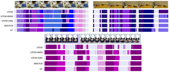 For a more intuitive elucidation of the role each module plays within BMUTCN, we have visualized the experimental outcomes. Figure 9 displays the segmentation results derived from our method on the three datasets. The various colored bars within the figure correspond to different actions in the video sequence. It is evident that the prediction sequence generated solely by the UTCM method contains numerous internal fragments, leading to an excess of over-segmentation errors, thereby resulting in lower F1 scores and Edit distances in the evaluation metrics. Post-implementation of the BMM approach, the output predictions for ambiguous frames near action boundaries become more discernible, and frame-level predictive accuracy improves, albeit with some residual over-segmentation errors. When coupled with the AIBS module, there is an effective reduction in internal fragmentation of the prediction sequence; however, boundary prediction accuracy sees only marginal enhancement. Ultimately, BMUTCN, through the synergistic integration of BMM and AIBS, efficiently leverages the advantages of these modules to achieve high-quality video segmentation.